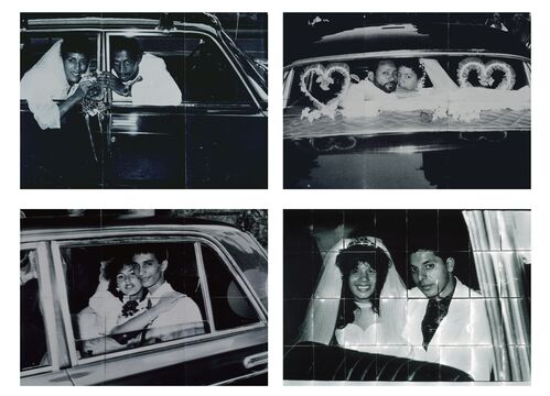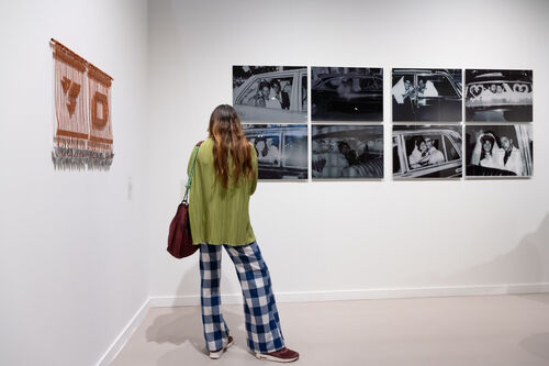 In this booth, that philosophy is on view with a wide range of works. A particular highlight is Brazilian artist Rosângela Rennó’s Farewell Ceremony (1997–2005), a series of photographs originally produced for the 1997 Havana Biennial. Taken from a set of wedding negatives given to the artist by a local Cuban photographer, these works depict newlyweds inside a car after their ceremony, a tradition shared by Brazilians and Cubans. The pieces have changed color over time, mutating into blues and browns, lending haunted quality to the works. This is further undergirded by the lost identities of the subjects in the photographs and the frozenness of their emotional moments.