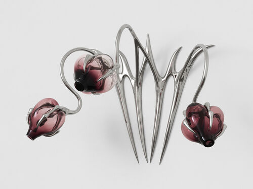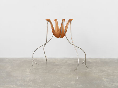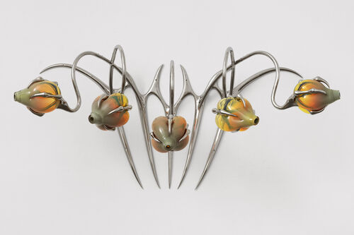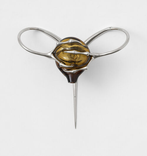 The wall-mounted works channel Art Nouveau’s organic forms but add a touch of menace to their elegance. Clawed steel arms reach out, gripping ripe orbs of blown glass as if they are being squeezed. Their symmetry and polish heighten the sense of danger, representing an anxious sort of beauty. Another Untitled (2025) work appears to depict two strong arms clasping an amber glass globe with vicious strength. The five works range from $45,000 to $80,000.
