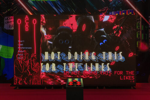 At the booth, a glowing control box with five numbered red buttons sits in front of a giant digital screen. Fairgoers during VIP day were beckoned to sit in the red-trimmed gaming chair and play the artist’s video game NO SPACE FOR REDEMPTION (2024), an immersive experience offered in an edition of three, priced at £18,000 ($23,900) apiece.