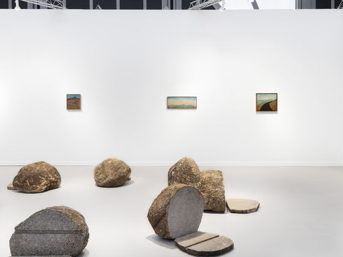 Eight bisected granite boulders form the center of Mendes Wood DM’s expansive booth, in which Kishio Suga’s Sliced Stones (2018) anchors a transnational dialogue between 1960s Japanese minimalism and Brazilian modernism. Associated with the Japanese and Korean Mono-ha (School of Things) movement that emerged in the 1960s, Suga incorporates industrial materials, such as stones or metals, to create his conceptual sculptures. The rocks in the installation were sourced from Brazil and are connected by a horizontal incision across each of the surfaces. The artist, who sliced the stones himself at the gallery, had his first show with Mendes Wood DM in May 2024.