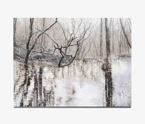 This series of nine works aims to capture the essence of what lies beyond the veil of landscapes in what the artist describes as a “mechanism for making visible what cannot be seen.” The result is works that are layered both literally and metaphorically, with the artist weaving different brushstrokes and textural flourishes to craft delicate, and often eerie, scenes.