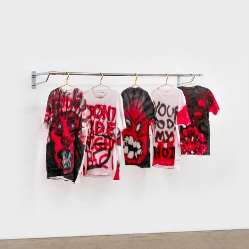 The booth itself is wrapped in a neon-ridden cybercore design, featuring provocative slogans like “Can you speak freely?” and “Would you choose this body?” An installation of five spray-painted T-shirts, OUR SKIN ISN’T TOUGH ENOUGH (2025), is featured on the left side, each priced under $10,000. Nearby, a cluster of raw, emotionally charged drawings—what gallery director Nicole Estilo Kaiser called “Danielle’s reactionary sketchbook to the recent legislation and changes that have really attacked trans people” are available for under $2,000.