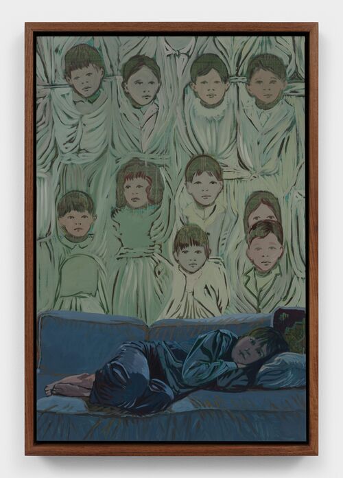 Five of the seven portraits feature sleeping figures. Rendered in bold brushstrokes, Self-Portrait Under the Moon-light (all works 2025), for instance, features a sleeping figure spread out on a blue-toned couch in the night. A similar figure appears again in Broken Images of the Night’Treasure; however, this time, the figure is being watched over by a crowd of angel-like figures in green robes. These works investigate our most private moments, during which we forfeit our guard and dispositions. In many ways, Tabouret appears to find and communicate a sense of comfort in these moments of vulnerability.