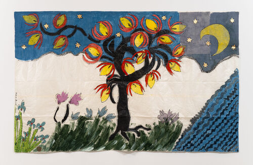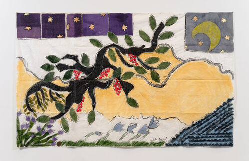 Each of the eight “Visited Lands” paintings illustrates a gnarled tree set under a crescent moon in the right-hand corner. In Visited Land V (2025), a black trunk blooms with red and yellow orchid-like flowers, spectral against the dark. These works evoke an intangible mystery, showing how close we are to the wide unknown.