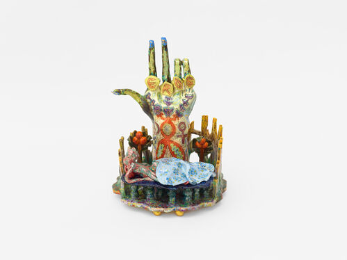 Hunt’s sculptures, embellished in gold luster and fired in kaleidoscopic glazes, portray different famous couples known for magic. Her small-scale clay sculpture Bliss Temple #3 (2025) shows late occultists Kenneth and Steffi Grant entangled in bed, a large hand hovering over them, referencing the god of love, Eros. Hunt is particularly interested in lesser-known subcultural figures from history. Another work, Bliss Temple #2 (2025), is modelled on early 20th-century artist and occultist Moinia Mathers (sister of philosopher Henri Bergson) with her husband Samuel.