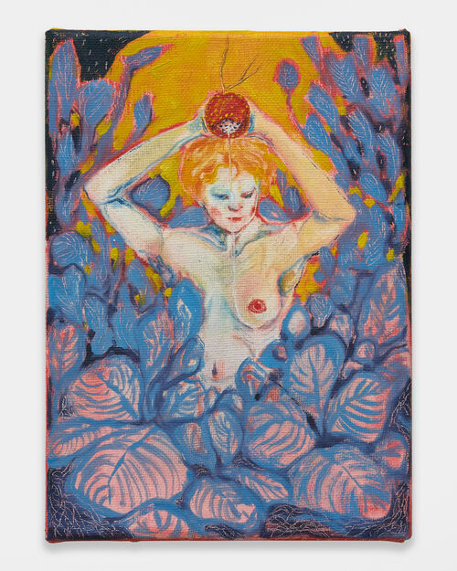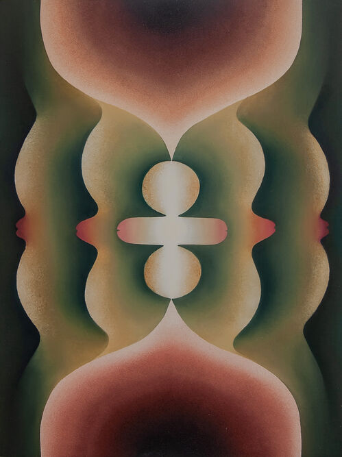 Contemporary artists continue to explore the transcendent impact of sex and creativity through the female form. American artist Loie Hollowell’s paintings, for instance, make suggestive references to genitalia and breasts. She has noted the influence of spiritual and mystical traditions, in particular, neo-tantric painting and esoteric pioneers like Hilma af Klint. Hollowell’s pieces bridge the physical experiences of the body such as abortion, birth, and breastfeeding, while also tapping into an intense feminine energy. Pressure in yellow-blue and mars violet (2022), for instance, comprises two simple round forms that meet in the middle, intersecting a vertical painted crease that is suggestive—though not explicitly—of genitalia. “I wanted people to get sucked into the color before they realized what they were actually looking at,” the artist has said of her previous works.