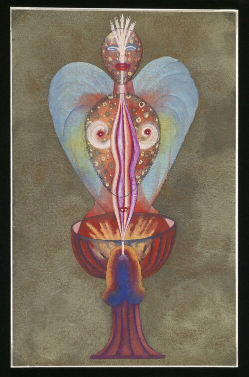 In Ithell Colquhoun’s “Diagrams of Love,” (ca. 1939–42), nude couples are entangled in intimate poses and drenched in sublime colors. In this series of paintings and drawings, she depicts the human body surrounded by radiant energy fields, inspired by alchemical traditions, kabbalah, and tantric imagery. “Diagrams of Love” sums up the British Surrealist artist’s vision of “sex magic,” a source of inspiration throughout her work.