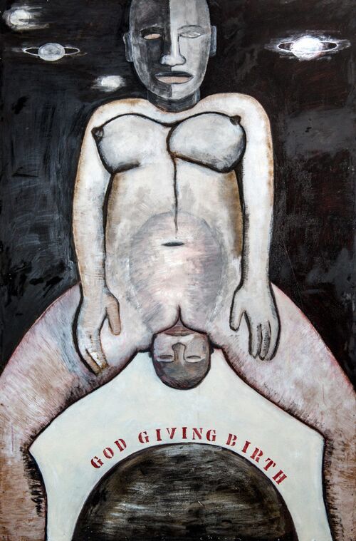 As open expressions of sexuality became more commonplace in the 1960s, more artists began to evoke the divine, magical potential of the female body. For example, Swedish artist Monica Sjöo’s provocative 1968 painting, God Giving Birth, was banned from public view in the 1970s following pressure from Christian groups. The radiant canvas—shown at Sjöo’s 2023 exhibition at Moderna Museet in Stockholm—depicts a nude woman, her face split down the middle by a dark shadow, with a baby’s head emerging from her genitals. The piece conveys an ecstatic female creativity that should be celebrated as natural and divine, yet is so often shamed and suppressed.