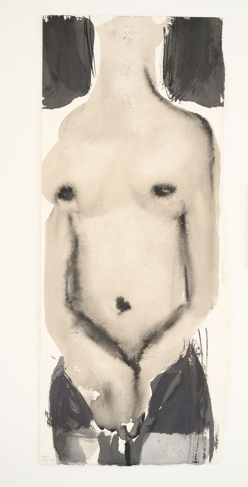 In Marlene Dumas’s Miss January (1997), the viewer is confronted by a monumental female figure, three meters tall, naked from the waist down, with powder-white face, deep red lipstick and kohl-smudged eyes. Her bold contrapposto pose, hands on hips and arms akimbo, radiates equal parts nonchalance and defiance, as if daring us to make any assumptions about her. Combining a formal mastery with loose, expressive brushwork, a striking use of color, subtle psychological depth, and a healthy dose of provocation, it is one of the supreme examples of the artist’s work.