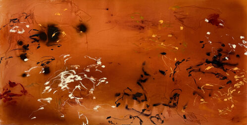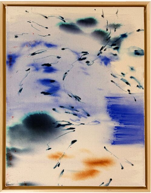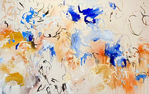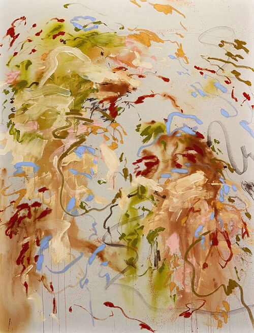 Freedom is the guiding principle of Celia Lees’s vibrant, gestural paintings: She gravitates to abstraction, she’s said, because it has “no rules.” Her unbounded approach results in canvases bursting with soft washes of color, covered in drips and splotches like Rorschach tests. Guided by intuition and feeling, Lees works at a large scale so that her whole body becomes an implement. The colors she selects for her physically impressive pieces signpost the emotions that she pours onto the canvas. Black and red works like 45 lives (2023) carry a sense of dark interiority, while brighter, airier works like I thought it rained last night (2025) feel unburdened.
