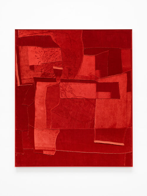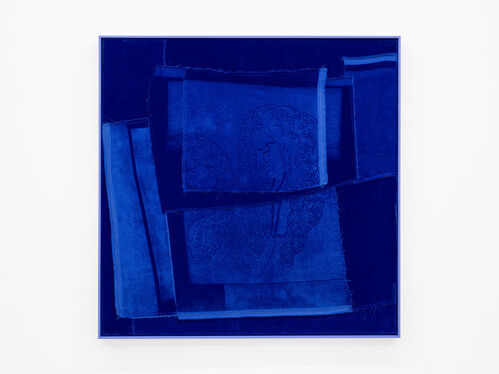 In the latest works of Swiss artist Cédric Eisenring, velvet evokes the elegance of theater and a fusty, wanton luxury. His square, monochromatic wall pieces are made of large, irregular swatches of the fabric, stitched together and then stamped using a woodcut printmaking technique. Up close, the raised contours of these embossed images—illustrations of people, rendered in a 19th-century style of line drawing—become visible.