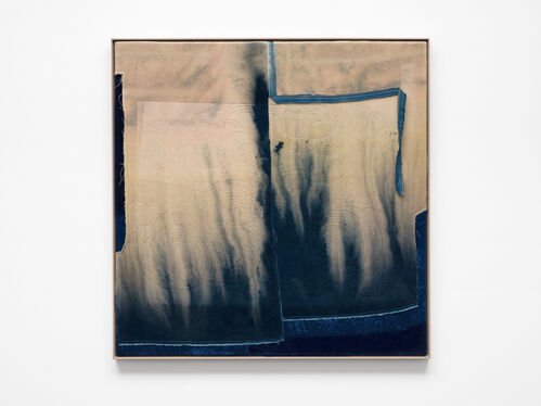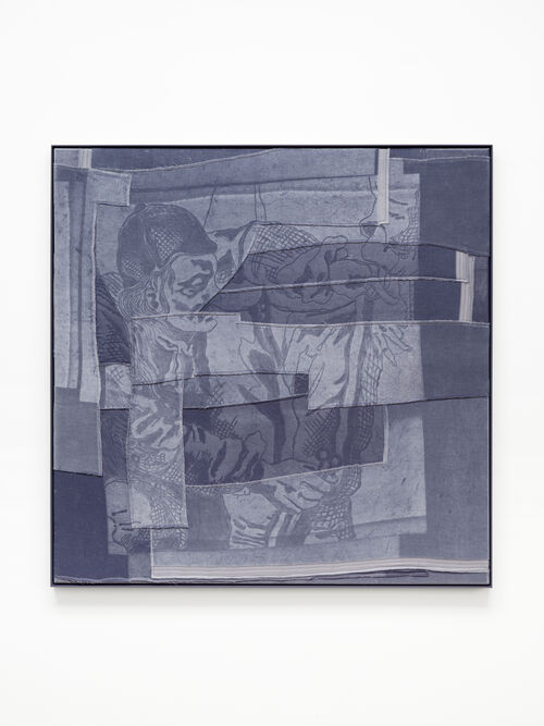 Such works stood out in DREI’s presentation at Basel Social Club, the alternative art fair that ran concurrently to Art Basel last month. One of them, Tailor (2025), is a navy and gray patchwork depicting a man sewing, its seams visible and raw. Due to the velvet’s irregular fibers, the image only reveals its meaning from certain angles, suggesting the ways that fiction and truth can be sewn together into a composite narrative.