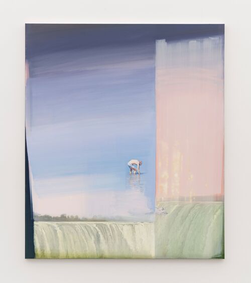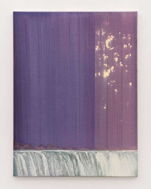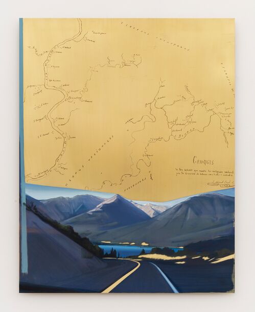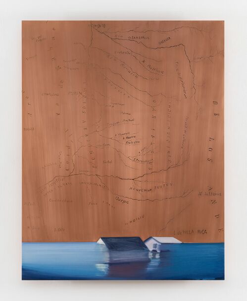 Chilean artist Christiane Pooley’s landscapes emerge from that same speculative impulse. For “Imaginary Country,” a new solo exhibition at Perrotin in New York, she worked with oil on engraved copper plates and canvas to create shimmering, unplaceable landscapes. Rather than depict real sites, she paints scenes that collapse imagination and memory, and probes how landscapes are remembered and who gets to define them. The violently cascading waterfalls and tremulous violet horizon of To Fold a Map (2024), for example, reference the work of Frederic Edwin Church—the Hudson River School painter who produced famous, idealized paintings of South American landscapes in the 19th century.