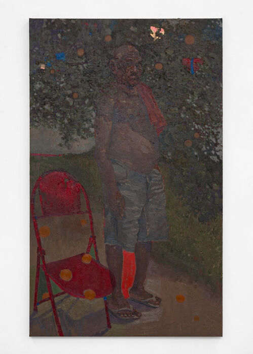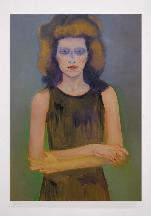 This new body of figurative work is expressive and dramatized. Rendered using gestural brushwork, Korini’s subjects share sharp features and haunting gazes. Their distinctive styling—ranging from a classic suit in Walking (2025) to a distinct ’70s shag haircut in Faux Fur, Gentle Skin (2024)—and the sparse context provided by their minimal backgrounds make them difficult to place in relation to one another. These figures are mysterious; inspired by the proliferation of social media, Korini has chosen to focus not so much on the identity of the individual as on the act of posing.