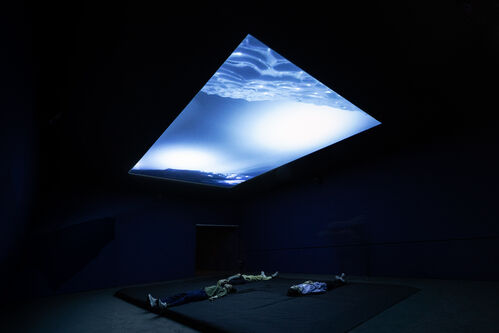 A similar recalibration happens to visitors in the Museum Tinguely show. Many rooms are shrouded in darkness, the dimmed lights evoking the mystery of the deep sea. A brand new work, Albedo (2025), features a nearly hour-long underwater video shot from beneath icebergs in the Arctic Ocean with the camera pointing upwards. The work is projected onto the ceiling, meaning viewers must lie down to see the shimmering halos of blue-tinged sunlight refract through the water. The score consists of vocalizations from orcas, sperm whales, and humpback whales that echo throughout the space, creating an eerie environment. It’s a topsy-turvy installation that immediately sets the stage: While the subaquatic usually feels distant, mysterious, or even scary, here, it becomes immediate and enveloping.
