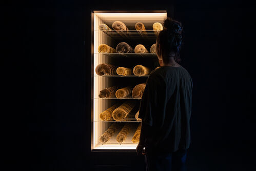 Several of the works on view engage with climate change and other forms of environmental devastation. Spiral Economy (2025) consists of a ready-made vending machine filled with ammonite fossils. The machine’s metal corkscrews echo the coiled shape of the shells left behind by this now-extinct species. This work critically explores how humans have extracted the riches of our planet for commercial use. “There’s this illusion of infinite resources. At the same time, we also turn everything we touch into a commodity,” Charrière said during a tour of the show.