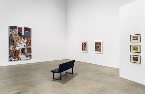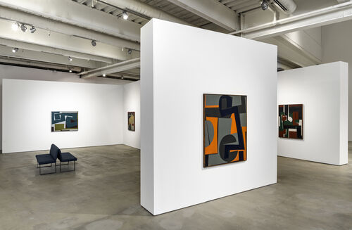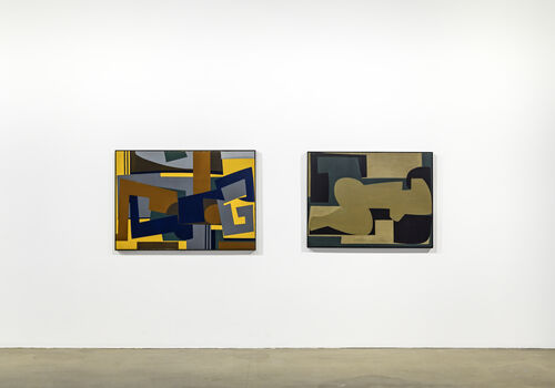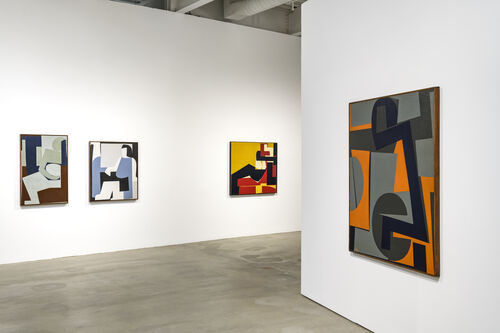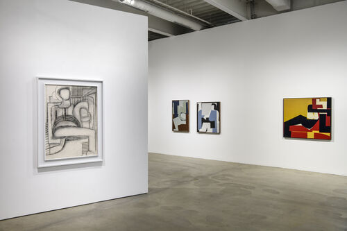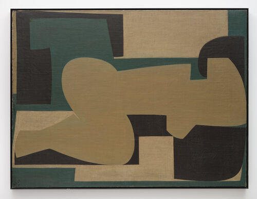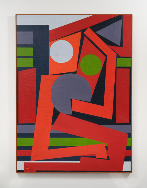 Born in Jamaica in 1928, Pusey lived in New York until 1988—with stints in London and Paris—before spending time working in Philadelphia and moving to Virginia. Inspired by fashion, Pusey often focused on abstracted human figures in her early work. In Suzy (1961), one of the earliest works in the show, Pusey depicts a model sitting with one leg propped up. Though flattened, the contours are subtly defined, and the skin color and shape of a body are clearly visible. Just one year later, Pusey depicted an even more flattened body in Lucy (1962), using color blocks to suggest different features, yet still depicting the model’s form as a cohesive whole. As her work progressed, bodies became more abstracted, as in Recumbancy (1963), where the artist evokes body parts through geometric shapes.