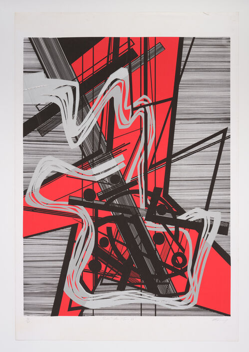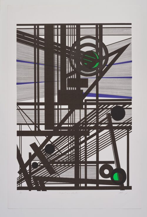 In May 1968, Pusey found herself in Paris as student protests that originally centered on the conditions of the education system escalated into a national general strike. “The city was exploding,” Ringle said. “Millions of people were in the streets. Pusey was surrounded by all of this.” During this time, students began making protest screenprints and teaching others to do the same. Pusey also learned to screenprint at that time, and made a series of four prints inspired by music. In one, Paris, Mai-Juin (1968), the abstracted, frenetic shape of a guitar bursts across the composition in front of dense lines that recall musical scores, perhaps a response to the loud, electrified state of the city.