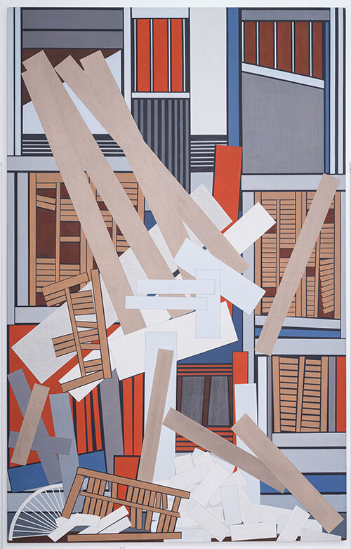 Pusey’s interest in architecture and technology is also apparent in the show. In Within Manhattan (1977), she depicts what appears to be a facade of a building with its inner construction revealed. Additional motifs like bricks and planks of wood are scattered across the surface. “While some people might see this as a picture of a city falling down around us, for Mavis, the construction of the world was about the possibility of the future, about technology, about history,” Ringle said.