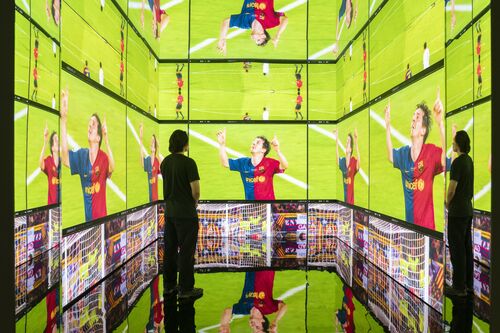 To create Living Memory: Messi – A Goal in Life, Anadol used millions of data points to construct an eight-minute immersive video that combines depictions of Messi’s movements during the goal with abstract forms that visualize the artist’s emotional connection to the moment. To help make these forms, the artist incorporated biometric data—such as Messi’s heartbeat and breathing patterns, as recorded during interviews where the soccer player recalled the goal—into image-creating algorithms. The result was an immersive digital sculpture, shown in 16K resolution, which integrated videos of the goal, interviews, the crowd, and the emotionally-charged abstract forms.