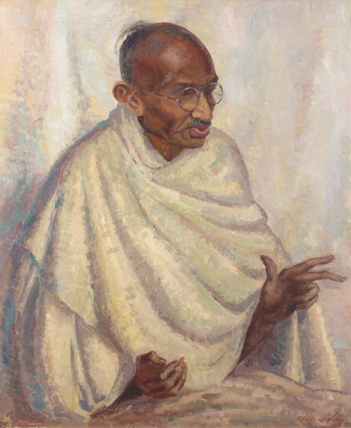 The painting depicts Gandhi seated cross-legged, wrapped in a white robe, his head bare and one finger raised as if mid-sentence. Leighton painted Gandhi while he visited London to attend the second Round Table Conference. At the time, she was living with political journalist Henry Noel Brailsford, an advocate for Indian independence who had met Gandhi the previous year. Brailsford’s connections allowed Leighton to meet with Gandhi, who permitted her to sketch him over multiple sessions. This portrait was featured in an exhibition at the Albany Galleries in London in 1931.