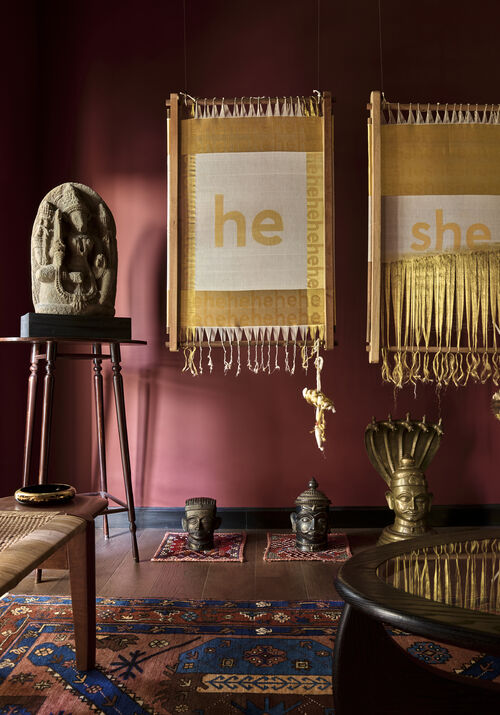 Take, for instance, his deep connection to “Home is a Foreign Place” (1999), a series by the late Indian artist Zarina, known for her restrained visual language that quietly echoes themes of displacement and longing. In the work, she weaves her mother tongue, Urdu, with memories of homes lost to the 1947 Partition, her husband’s moves, and eviction—capturing a poignant, enduring longing for home that quietly haunts a life spent in transit. “Zarina, in a traditional sense, is not queer at all,” he said. “But she speaks to exiles of the mind, exile of the body. Of displacement and longing—both mental and physical. That sense of being in internal exile, of home being a foreign place—that’s a very queer subject matter.”