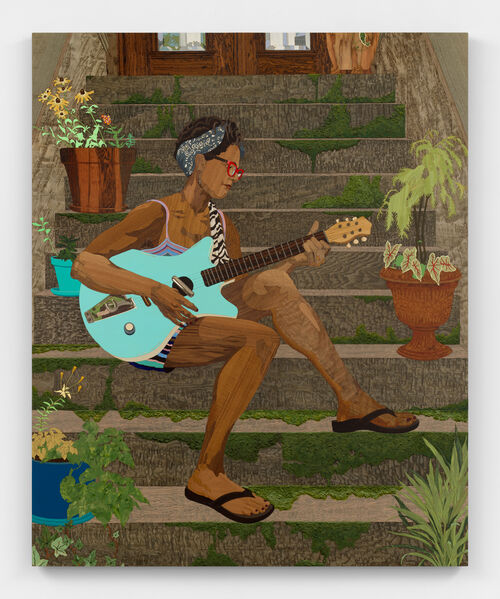 Taylor’s choice of subjects is equally radical. Electric bikes, pubic hair, N95 masks, C-section scars, diseased trees, and leopard-print sneakers are just a few of the objects that appear in her compositions. “Traditionally, inlay is associated with wealth and power, palaces and churches,” she said. “So when I depict ordinary scenes or people often excluded from historical imagery, I’m using the seriousness of the medium to give them gravity and importance.” For example, Anthony Cuts under the Wburg Bridge, Sunset (2021), included in her exhibition “Future Promise” at James Cohan, depicts a hairdresser cutting his patron’s hair amid discarded oil barrels and broken furniture heaped around bridge pylons. In Cheryl Before She Left for Maine 2020 (2022), a female figure wearing a blue bandana and flip-flops sits on a building stoop with a turquoise guitar on her lap. Taylor is currently at work on a series of similarly styled portraits for her upcoming exhibition at The Smithsonian’s National Portrait Gallery, in Washington, D.C.