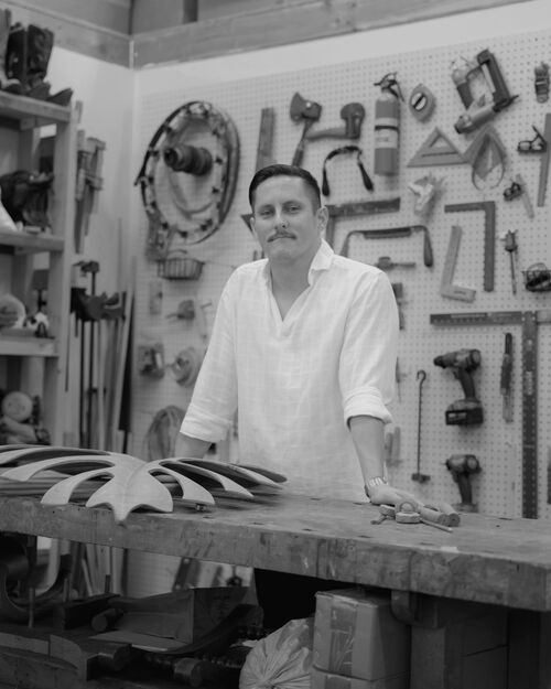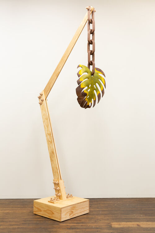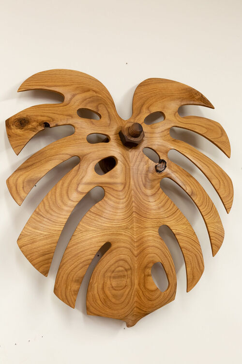 Raul De Lara, a Mexico-born artist now based in Brooklyn, also approaches woodworking as a form of storytelling inspired by devotional objects. In particular, he is inspired by the miniature Catholic icons that can be found in local markets across Mexico. “It’s like magic,” said De Lara. “At some point in the whittling process, a tree branch is turned into a holy saint.” Today, he transforms everyday American household objects, like dining chairs and houseplants, into poetic yet playful symbols of immigrant ambition and resilience. Incorporating 3D sketchbooks, VR headsets, and hand- and electric-carving tools, his practice borrows from traditional furniture design, folk art, and the natural world. “When I’m not working, I spend a lot of time hanging with trees and looking for leaves in the park.”