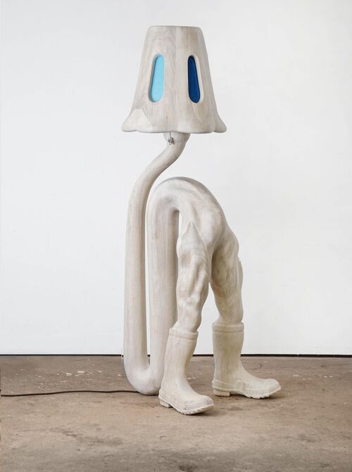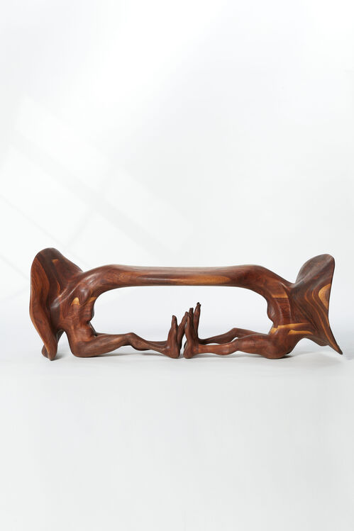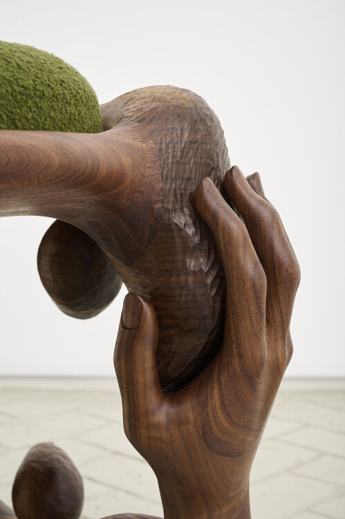 For Pocsik, whose works were on view last year as part of LOY Gallery’s show “A Trail to Chase,” there’s no distinction between art and design. “No matter what I’m working on, I’m trying to challenge the viewer’s perception and push the bounds of what a sculpture or a piece of furniture can be,” he said. Accordingly, his figurative sculptures feature long legs and contorted torsos with wooden lamp shades replacing their heads, as seen in Sitting with One Shoe in Walnut (2024). Meanwhile, his upholstered benches are supported by meticulously carved forearms and hands, as in Damned to Love You (2021). His hyperrealistic wall works, featured in a recent solo show at Nazarian / Curcio, also depict anatomical body parts that intertwine with botanical forms, such as Two Gerberas with Hands (2024), which features ebonized walnut daisies with swirling stems that sprout human hands.