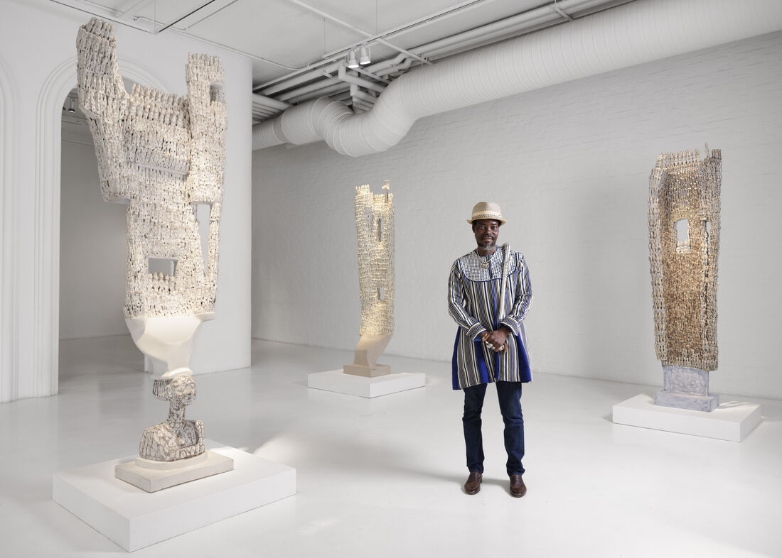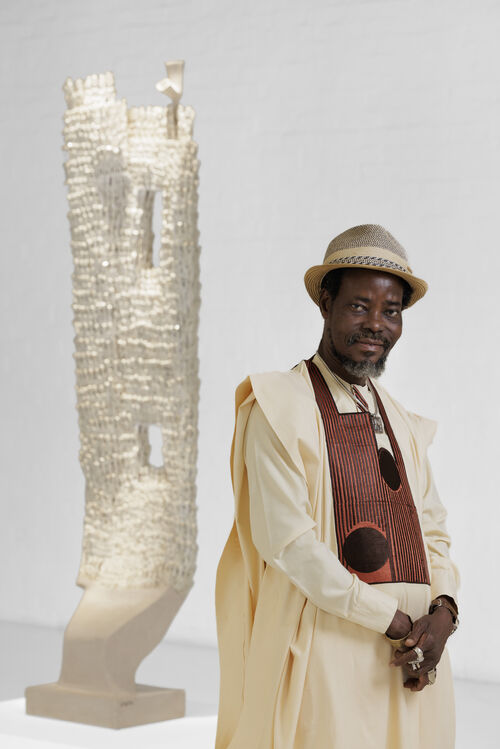 The sculptures featured in his exhibition, “Ejire (Double Rhyme),” at Southern Guild’s Cape Town location earlier this year, are both figurative and abstract. In Powerful Woman (2024), rows and rows of white-painted statuettes sit atop a carved bust of a woman, like an exquisite headpiece. The dolls form a rippling ladder in Ascension (2024), with two carved hands extending from the top. Another work, Déesse (2024), features a cobalt blue column that forks into two shorter extensions. Zinkpè attributes the animated quality of these works to the warmth and tactile intimacy of his material. “When I work with wood, I feel that I am not just creating a form,” he said. “I am extending its life and giving it a new story to tell.”