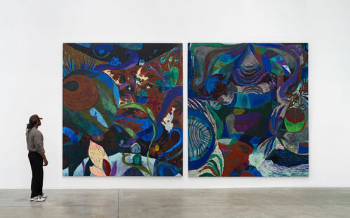 Born in Rio de Janeiro in 1993, Almeida works with a variety of materials, including paper, oil, plastic, and fabric, exploring themes such as memory, transformation, and nature. Her work is often informed by her childhood in Brazil and identity as the daughter of a pastor. Recent large-scale works feature fluid swaths of paint layered with oil pastels, resin, and pigment, where boundaries between shapes dissolve into fragmented, kaleidoscopic compositions.