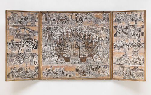 Over time, this vision was also reshaped by conflict and spiritual revolution. Featuring examples of sacred art movements that revitalized Yoruba ritual practice and postwar adaptations of uli, the curvilinear designs of the Igbo people, the exhibition emphasizes how modernism in Nigeria was never static.