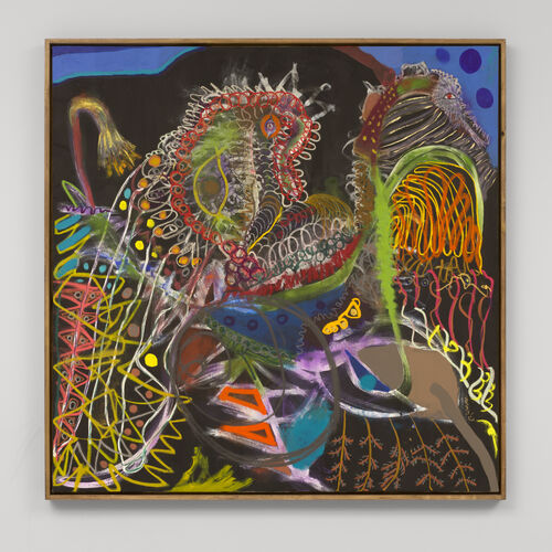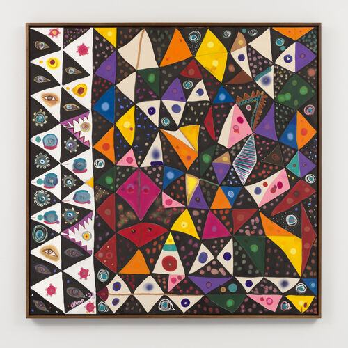 Working with oil, acrylic, spray paint, collage, and sewn elements, Uman depicts spirals, grids, eyes, stars, and hybrid creatures in bold palettes. The results are phantasmagoric fields of symbols and geometric forms. Much of her imagery begins from personal experience, but she often experiments with how much of herself to reveal. As she once explained, “I want to push and continue to grow, and that means I have to take myself out of the work. It’s something I’m interested in, how much to add or remove myself.”