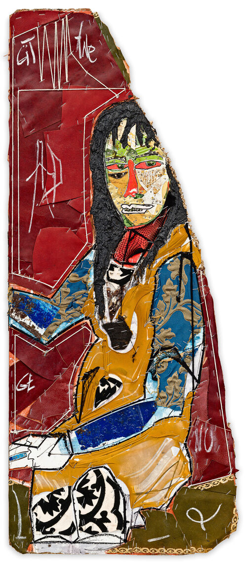 One of the works on view, A Vos marques ! Prêt ! Illegal – On Your Marks ! Get Set ! Illegal (2025), captures the exhibition’s sense of urgency. In the experimental portrait, Diop combines painting techniques with various found objects, layering textiles, netting, book covers, and expressive marks to bring his subjects to life. The piece, which mirrors the starting line of a race, draws inspiration from the story of Olympic medalist Jesse Owens, speaking to themes of freedom and resistance.