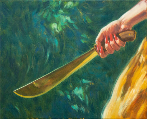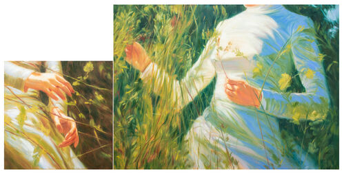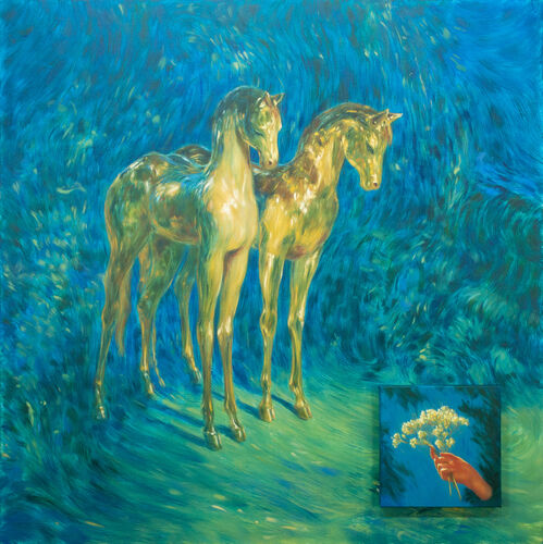 Portales favors swirling, gestural brushstrokes and foregrounds soft details, like dainty hands holding flowers and rippling, shimmery fabrics. His aesthetic is deliberately feminine—signaling a rejection of notions of masculine strength often embedded in heroic tales and of machismo in Cuban society more broadly. “Since leaving Cuba, my universe has expanded and freed itself from many burdens and prejudices,” the artist recently told Portray Magazine.