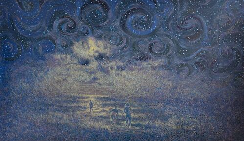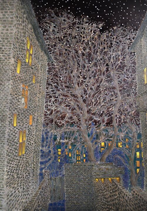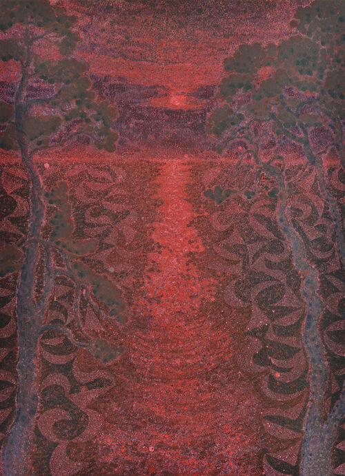 Josh Raz’s large-scale paintings look as if they’ve been lifted from the edge of a dream, with pattern-rich surfaces depicting glistening skies and cities in cosmic, gestural swirls. Painted from imagination, these landscapes hover between the fantastical and the familiar. They could be anywhere, leaving room for the viewer’s own associations and memories.
