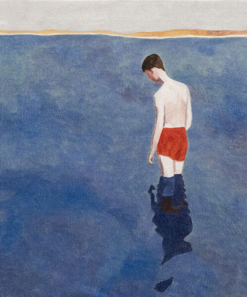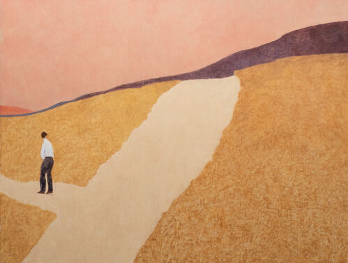 Figures are defined here less by their identity than by their affect: Their postures often suggest contemplation or fatigue. In El cami mes llarg (The longest path)(2024), an ambiguous figure has taken a fork in the road, but glances back—perhaps regretfully—at the path he left behind. The simple gesture carries surprising emotional weight. As in many of the artist’s recent works, the painting’s warm tones are gentle and subdued, contributing to an enveloping sense of peace.