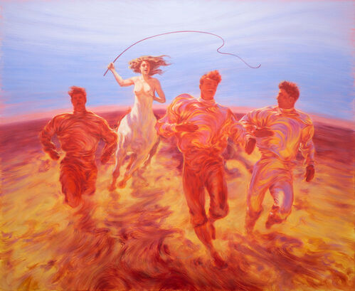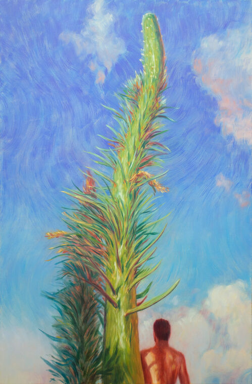 Marlon Portales’s enticing paintings are like pages torn from a lost storybook—fantastical, vividly colored, and mysterious. Borrowing a sense of the natural sublime from the Romantic painters of the 19th century, then dialing up the saturation, the Cuban artist paints scenes evocative of myths or fairytales. His solo presentation with Miami’s Spinello Projects at The Armory Show earlier this month featured a cast of tragic-seeming heroes. In The Last Man (2024), a figure in golden, princely attire is pierced by arrows; in The Dance (2025), three men flee from a fearsome, whip-brandishing female centaur. Even when the narrative context is unclear, the paintings are inflected with high drama.