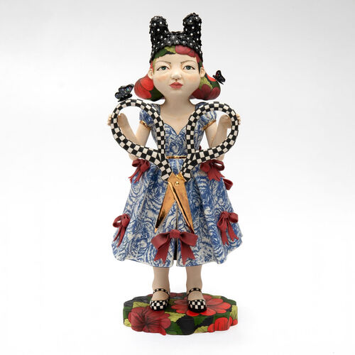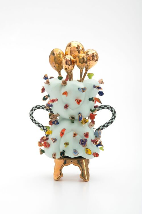Ahrong Kim’s surreal ceramic sculptures turn the body topsy-turvy. Across her work, feminine figures dressed in cutesy outfits pop out of vividly patterned, brightly colored surfaces and curvy, disembodied legs stick out of unexpected objects. Drawing together Korean and Western cultural references, these mishmashed figures explore transformation through a cheeky and unexpected lens.