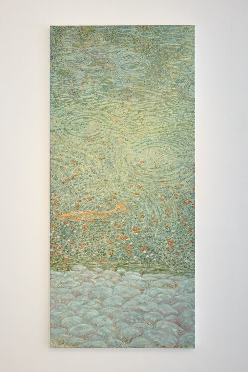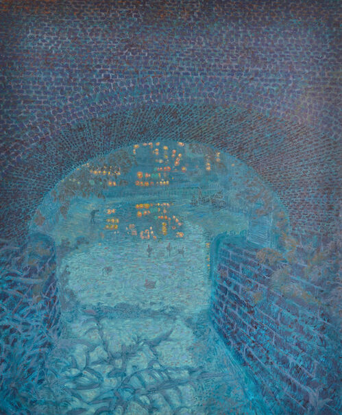 Earlier this month, Raz showed new works in Ronchini Gallery’s presentation at The Armory Show—one of Artsy’s best booths at the fair. One of those paintings, Deep Ford (Mudlark at Deptford Creek)(2025), peers through a dark brick-lined tunnel under a bridge, which opens onto a twinkling cityscape. The scene is tinted the dark blue of dust; lights bounce off the water’s surface like glowing golden beads. Raz’s loose brushstrokes and rendering of shadows in color reference Impressionist forebearers like Claude Monet, giving the painting a timeless appeal.