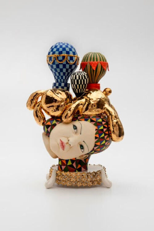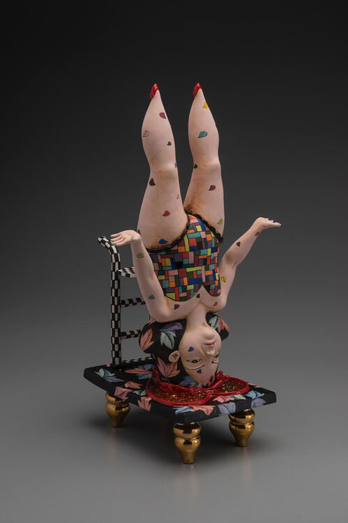 Kim’s current solo show, “Last Rehearsal,” at LaiSun Keane in Boston (on view through September 28th), features works dating from 2021 to the present. They embody the transformative experiences of motherhood, striking a playful tone while reflecting on this stage of life. For example, in Occupied (2025), the top half of a woman’s head, forehead crinkled with worry, sits atop a harlequin-patterned stool. The tiny gilded hands stuck to her hairdo point in many different directions, evoking a multitude of conflicting mental demands. Kim’s signature motif, upside-down, disembodied legs, protrudes from the sculpture’s top in a whimsical flourish.