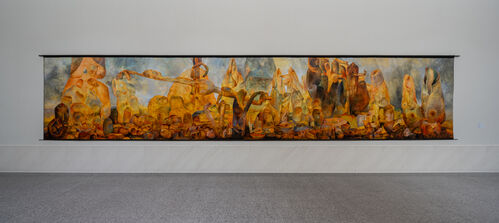 Another huge mural-like work sweeps across the wall outside AAC’s Learning Center. It comprises over 800 small drawings made in collaboration with more than a thousand nursery school children from the surrounding area. The swirling mass of color on a background of blue is a testament to the intersection of art and community organizing in the work of Hawaiian artist Solomon Enos. However, it is his “Pala (Ripe)” series of paintings that best captures the ideas of human mutation and adaptation that emerge throughout the Triennale.