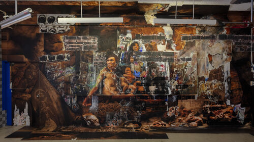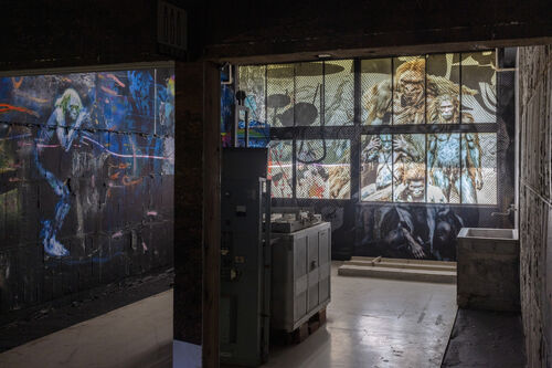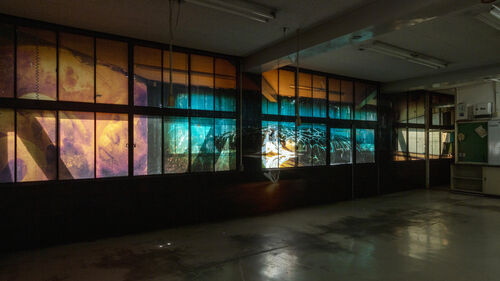 Each edition of the Aichi Triennale makes a point of exploring its themes in the context of the surrounding region, this time focusing on Seto City. Argentine artist Adrián Villar Rojas’s layered digital images are presented in a recently abandoned school, now vacant due to the area’s dwindling child population. Where we might imagine periodic tables and finger paintings once hung, the classroom walls are now covered floor-to-ceiling with messy collages of digital renderings. Pixelated fires tear across the space in one room, while in others, intimidating gangs of muscle-bound Neanderthals glare out at the child-size sinks and workbenches that still fill the space. Villar Rojas’s images even plaster the windows, blocking out the light of day.
