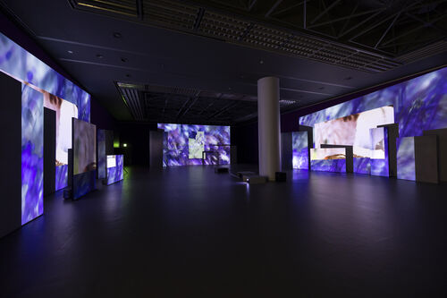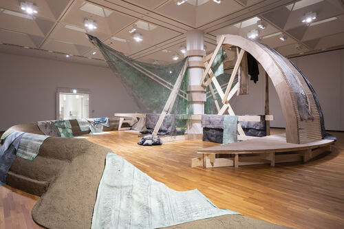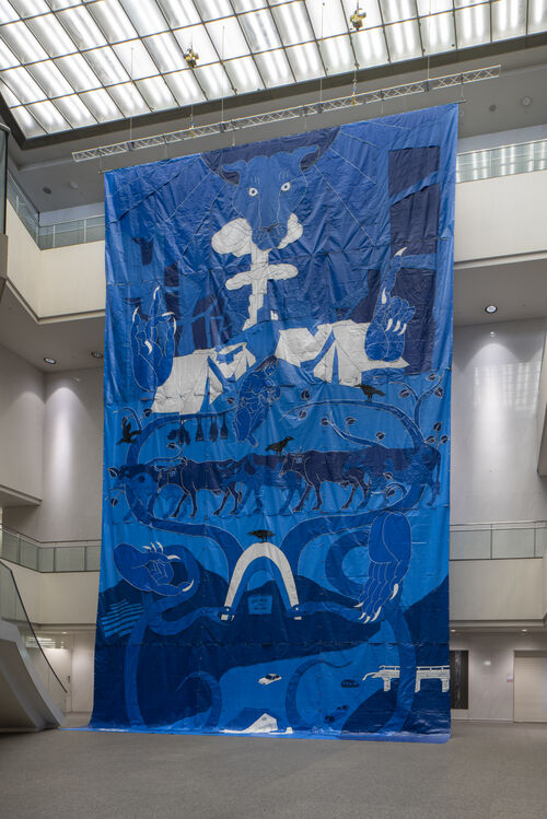 Much of the work in the Triennale seeks alternatives to the dominant, human-centric perspectives on looming catastrophes, both climate-related and man-made, that define our era. Across her practice, Japanese artist Kubo Hiroko highlights forgotten mythologies and marginalized histories, particularly those of women. Repurposing industrial materials such as netting, mesh, and farming supplies, her sculptures resuscitate the heritage lost to war, societal collapse, and environmental disaster. For Aichi, she presents The Lion with Four Blue Hands (2025), a tapestry made from striking blue tarps that cascades down across three levels of the Aichi Arts Center (AAC).