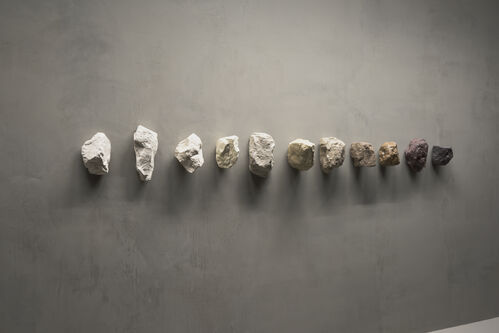 Smith’s minimal, wall-mounted installation Forest (2022) arranges 11 ceramic-cast lumps of coal in a precise line. These 11 sculptures are each fired in glaze mixed from coal ash gathered at 11 different power plants around Australia. These plants source their own coal from quarries in the surrounding areas, meaning each sample is distinct—a unique geological record. The glaze that incorporates coal ash drawn from the oldest quarries shines bone white, while more recent samples (18 million years old) are suffused with the dark,earthy color of soil still rich with minerals. The gradient that emerges is a timeline told in color, tracing the development of coal, which is itself pivotal to the development of human history.