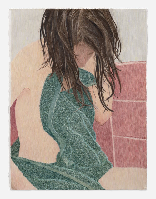 Kings’s drawings are built up from hundreds of tiny colored marks, creating a hazy aesthetic. These drawings, though focusing on the solid human body, are fluid, their marks dancing before the eyes. This is a time-consuming, meditative process which mirrors the peaceful experience of swimming in wild water.