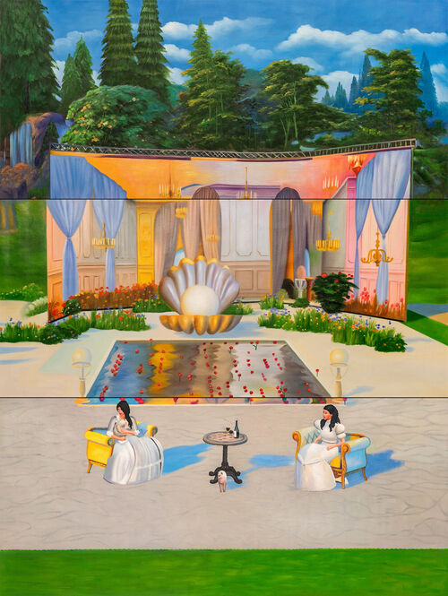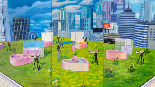 Another highlight was Arsty Vanguard alum Mak2’s iconic triptych Home Sweet Home (2019), which takes inspiration from the video game The Sims. Each digital image is divided into three sections, with each painted by different craftsmen hired through the Chinese e-commerce platform Taobao. The resulting disparities between fantasy and reality underscore the humor and critical lens signature to Mak2’s practice.