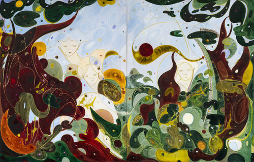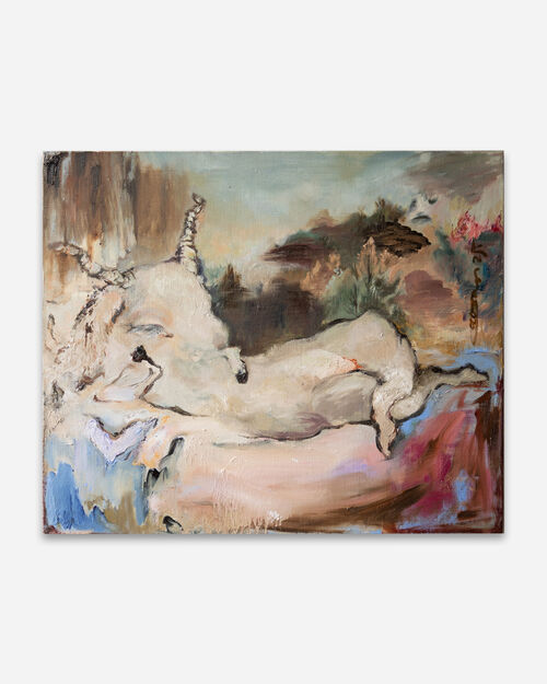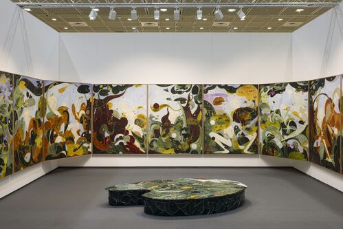 For its booth, the gallery presents a new installation and series of paintings by the British artist that revisit the Greek myth of Narcissus through a contemporary lens. Nine vibrant paintings are hung in a semi-oval formation, each capturing a different moment of the myth and arranged in sequence. At the center is a ceramic pond, evoking the fleeting nature of Narcissus’s reflection.