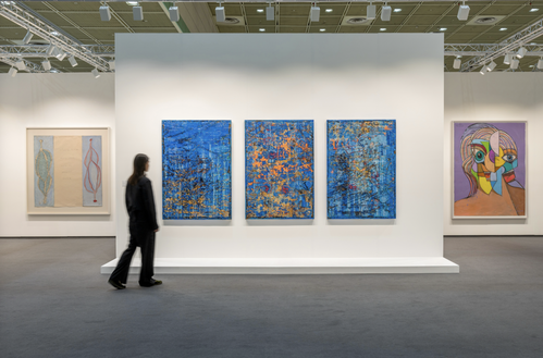 Also on view were works by Lee Bul, who joined the gallery earlier this year and this week opened a major show at the Leeum, Samsung Museum of Art. Works featured include Untitled (Cyborg—Velvet #23) (2019), a suspended, headless female cyborg draped in velvet that questions ideals of technological perfection. Also on view is the crystalline, fragmented Untitled Sculpture (W6-1) (2010), part of the artist’s acclaimed “Sternbau” series, which references architectural structures to explore utopian modernity and its collapse. Also anchoring the booth is a cerulean triptych by Mark Bradford, who currently has a show at the Amorepacific Museum.