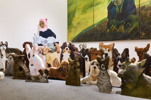 Seoul tastemaker Hakgojae Gallery’s booth provided one of the most photographed moments of the fair’s VIP day. What immediately drew visitors’ attention was a group of 30 wooden dogs and an elderly man holding a leash.